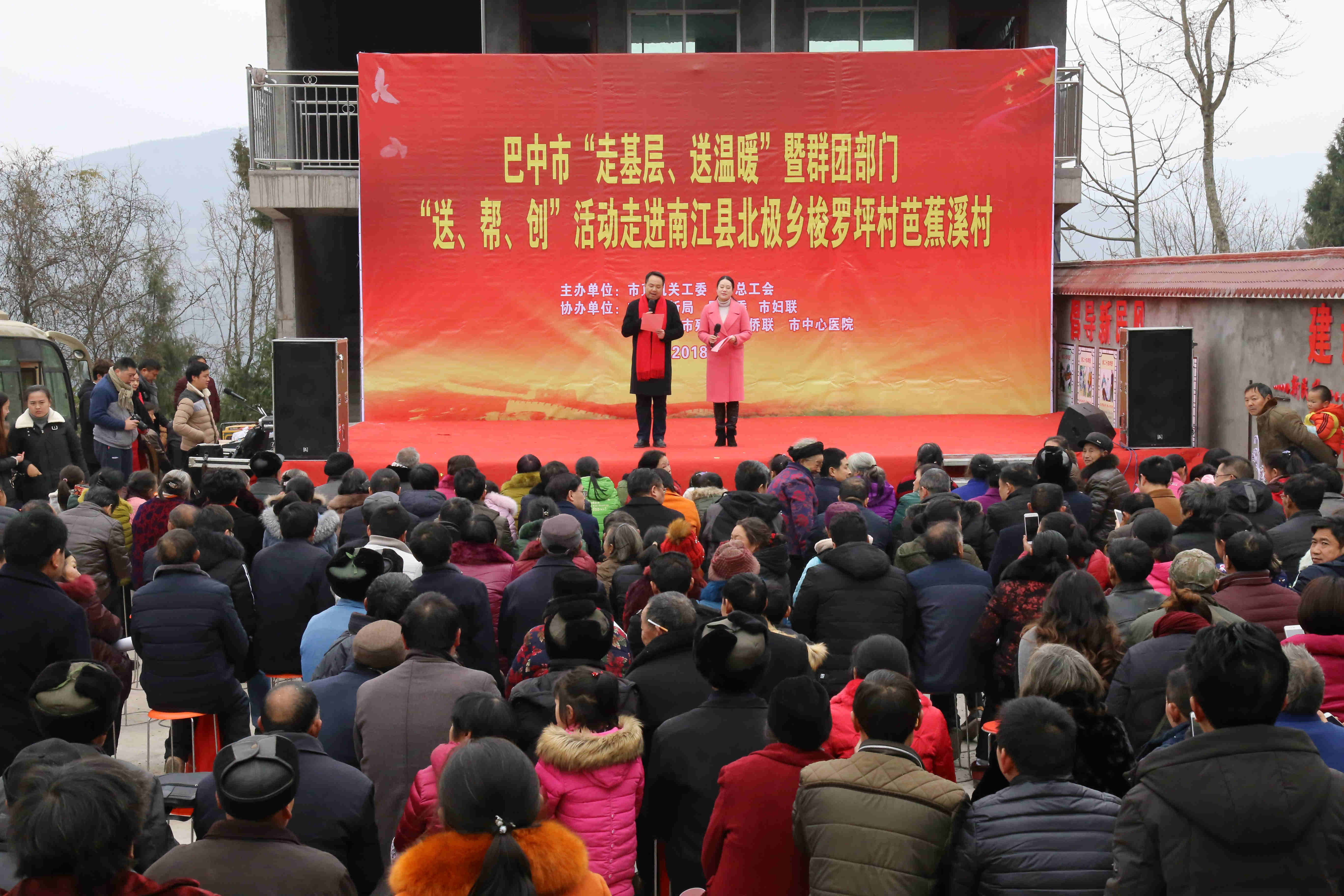2月6日,市委常委、市直工委书记、市总工会主席袁闻聪常委率领市直工委机关及市级群团组织干部职工,深入南江县北极乡梭罗坪村开展“走基层·送温暖”暨群团组织“三送、三帮、三创”系列活动。南江县委常委万国、吴开财,县直工委、群团组织,北极乡党委政府、梭罗坪村和芭蕉溪村村民等400余人参加。